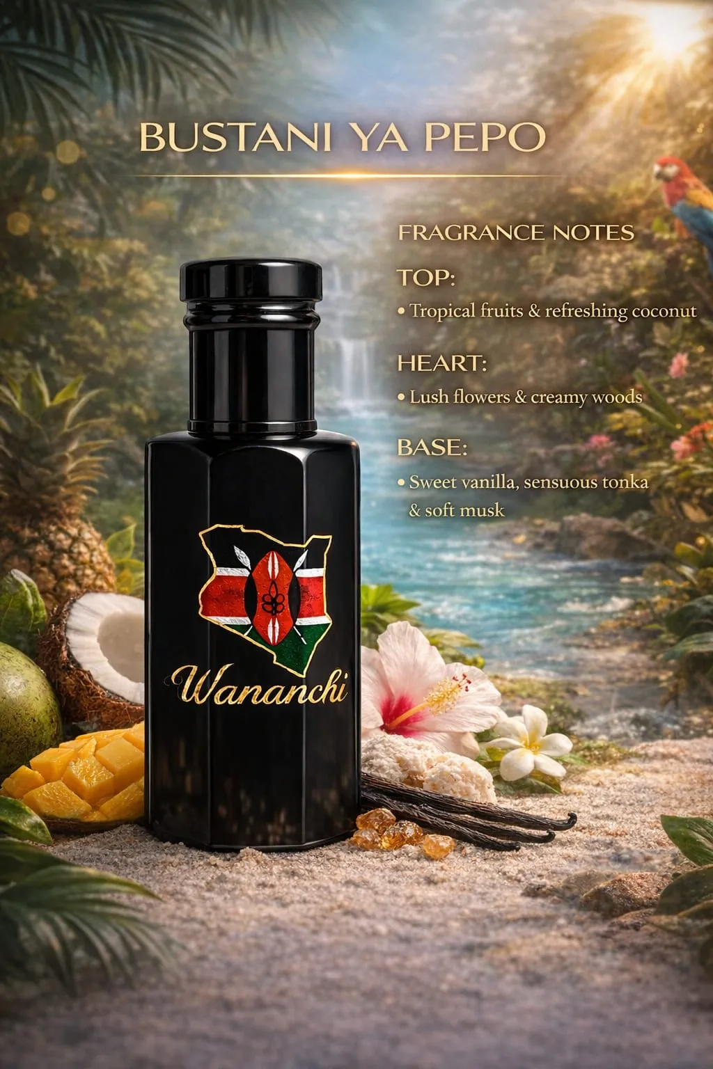 BUSTANI YA PEPO opens with juicy tropical fruits blended with refreshing coconut, creating a bright and exotic first impression. The heart blooms with lush flowers and creamy woods, adding softness and depth. The base settles into sweet vanilla, sensuous tonka, and soft musk for a smooth, comforting finish.