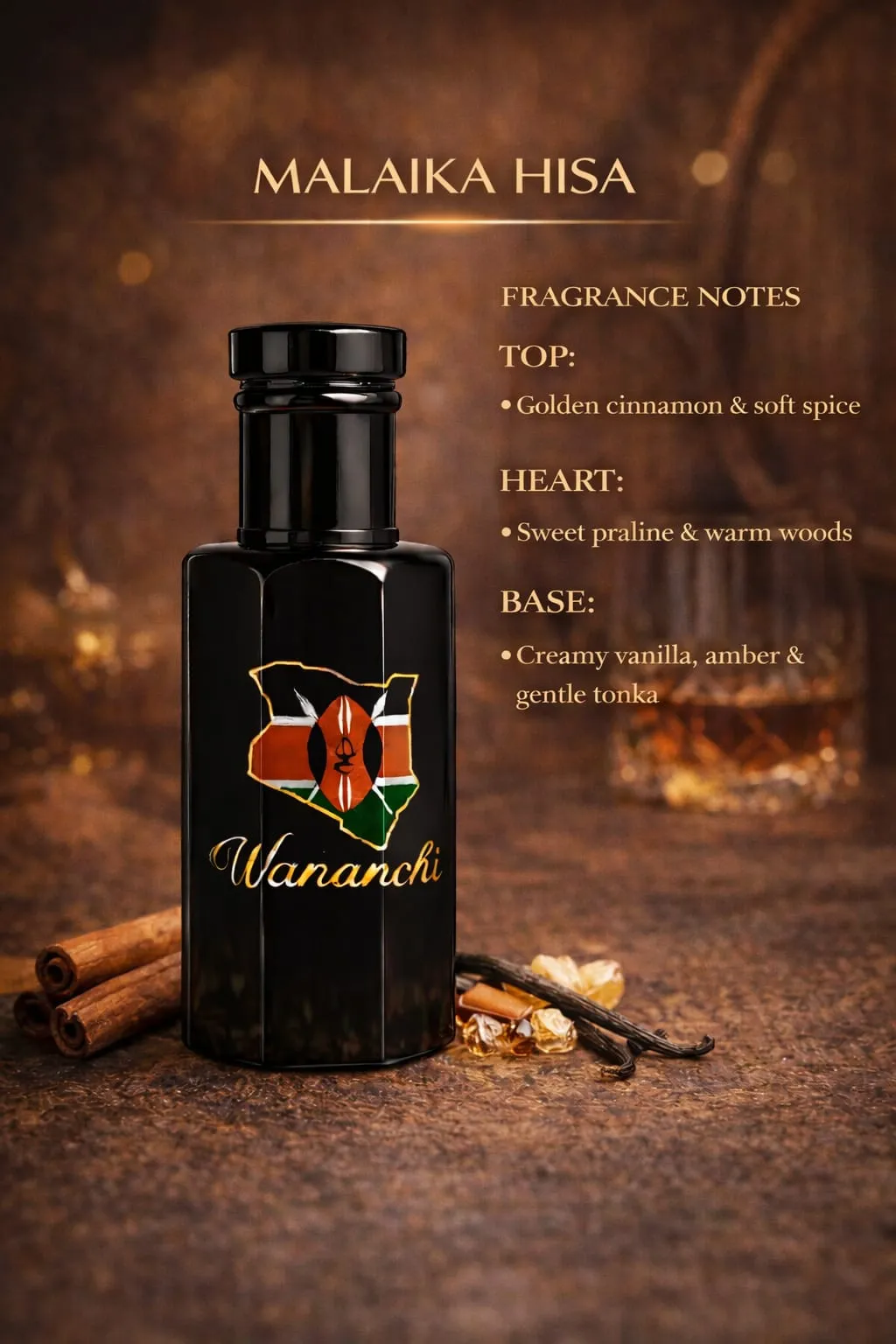 MALAIKA HISA opens with golden cinnamon and gentle spice that feels cozy and refined. The heart reveals sweet praline blended with warm woods, adding depth and smooth sweetness. The base settles into creamy vanilla, amber, and soft tonka for a comforting, long-lasting finish.