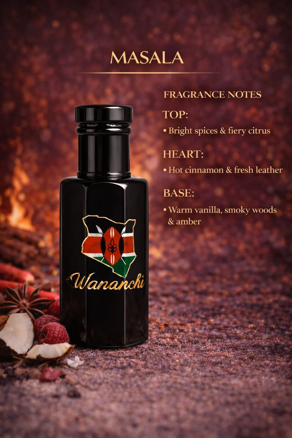MASALA opens with bright spices and fiery citrus that immediately command attention. The heart reveals hot cinnamon blended with fresh leather, giving the scent power and attitude. The base settles into warm vanilla, smoky woods, and rich amber for a long-lasting, intense finish.