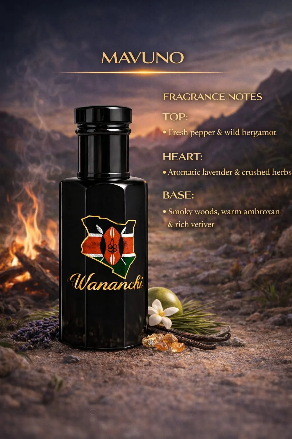MAVUNO opens with vibrant fresh pepper and wild bergamot, delivering an energetic and uplifting start. The heart reveals aromatic lavender blended with crushed herbs, adding a clean yet rugged character. The base settles into smoky woods, warm ambroxan, and rich vetiver for a powerful, long-lasting finish.