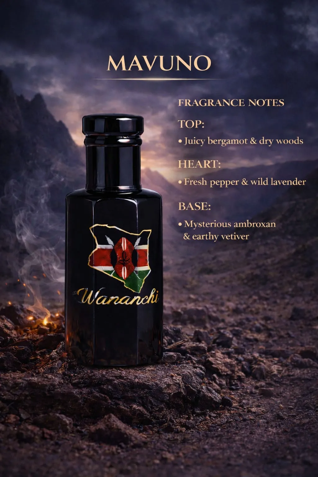 MAVUNO opens with juicy bergamot blended with dry woods, giving a crisp and confident introduction. The heart brings fresh pepper and wild lavender, adding aromatic strength and clarity. The base settles into smooth ambroxan and earthy vetiver, leaving a clean, modern, and long-lasting trail.