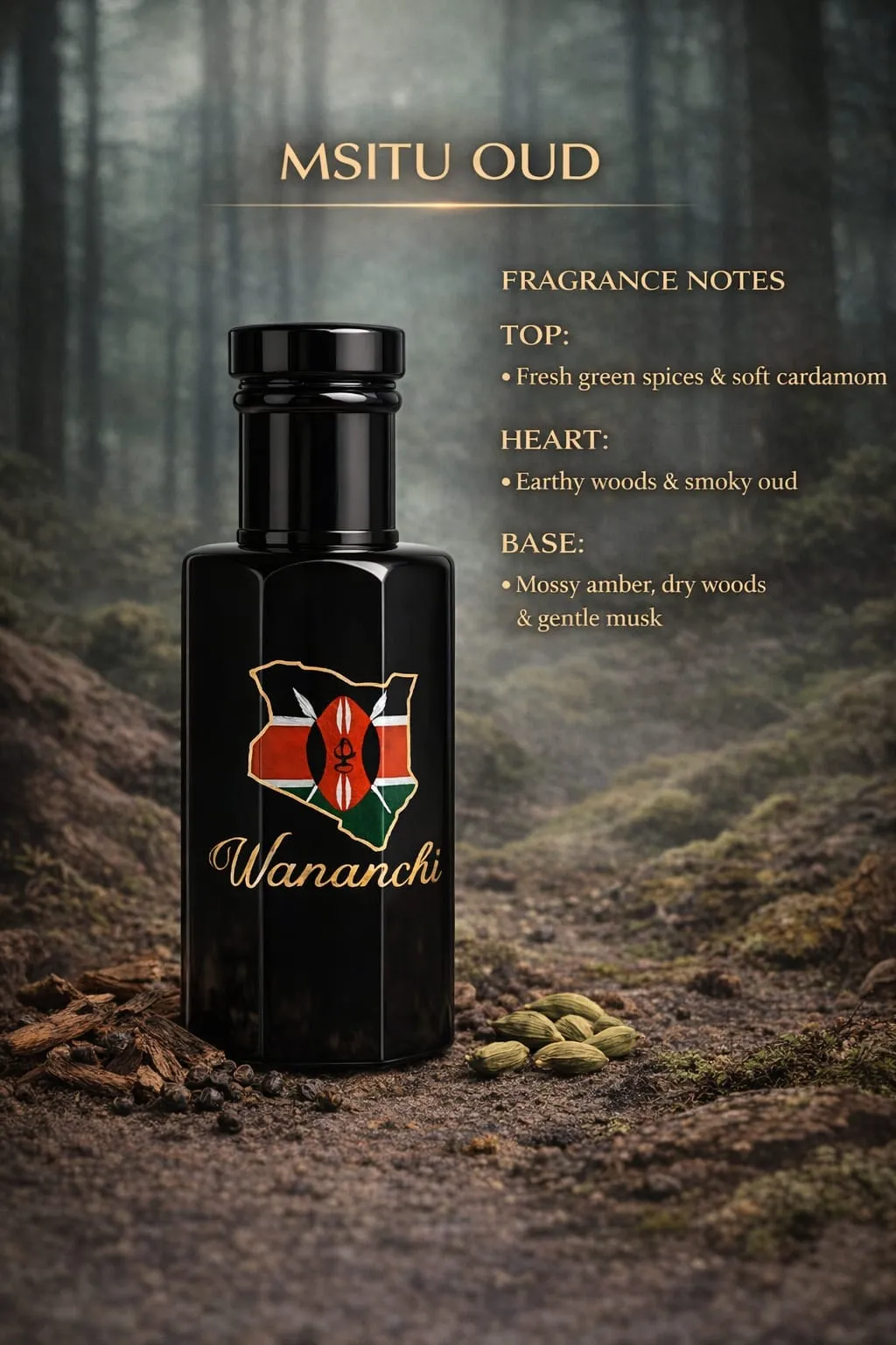 MSITU OUD opens with fresh green spices and soft cardamom, creating a crisp yet grounded start. The heart reveals smoky oud blended with earthy woods, giving the scent strength and depth. It finishes with a smooth base of mossy amber, dry woods, and gentle musk for a calm, masculine trail.